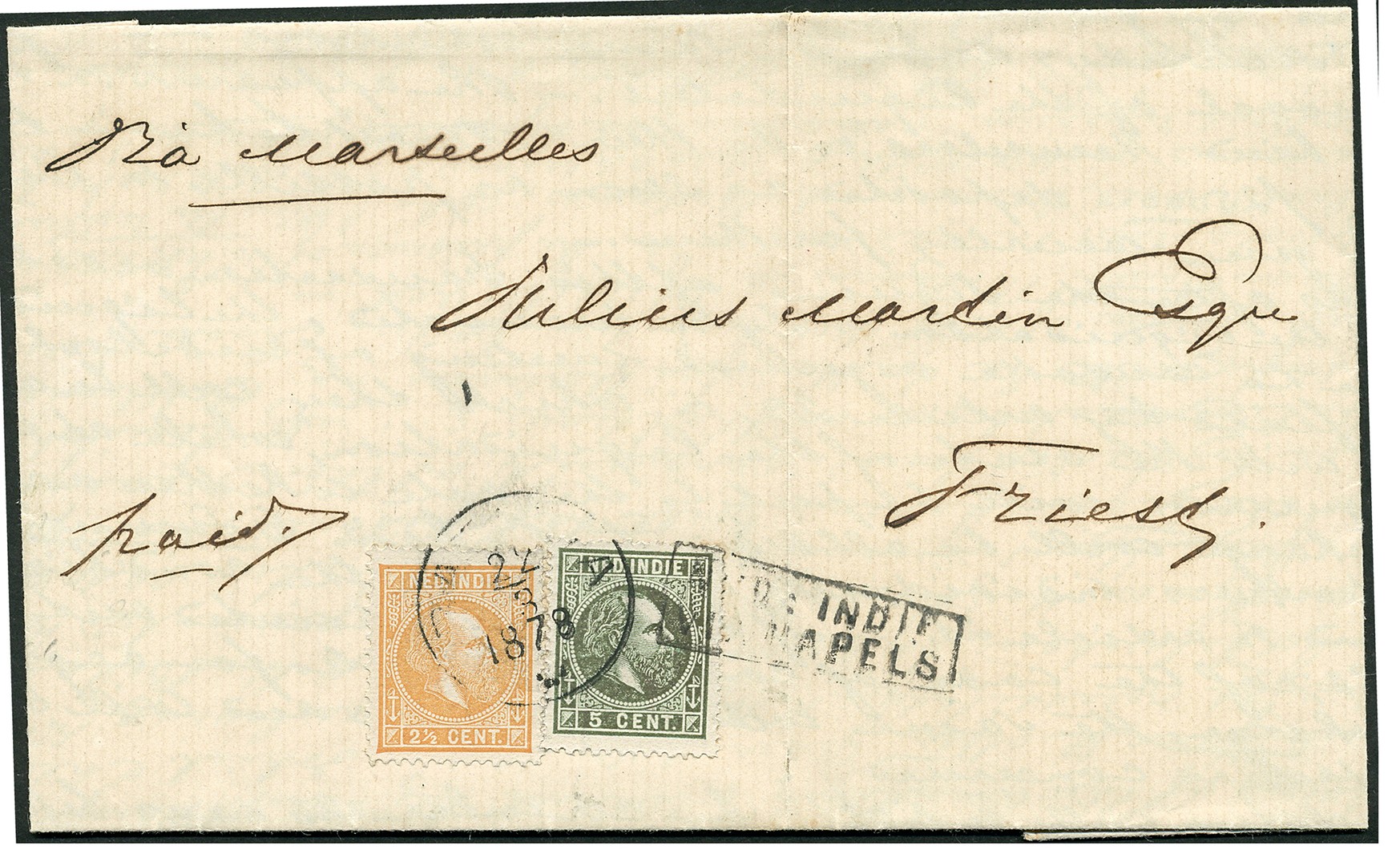 OOSTENRIJK-HONGARIJE. 2½ Cent nr. 7F en 5c nr. 8C op een gedrukt stuk (vert. vouw) in de gew. klasse 0-50 gr. van Soerabaija 22-3-1878 via Napels (afz. schreef 'via Marseille') naar Triest 22-4. Een uitermate zeldzaam tarief, slechts geldig van 1 mei 1877 tot 1 april 1879, en bovendien naar een zeldzame bestemming!