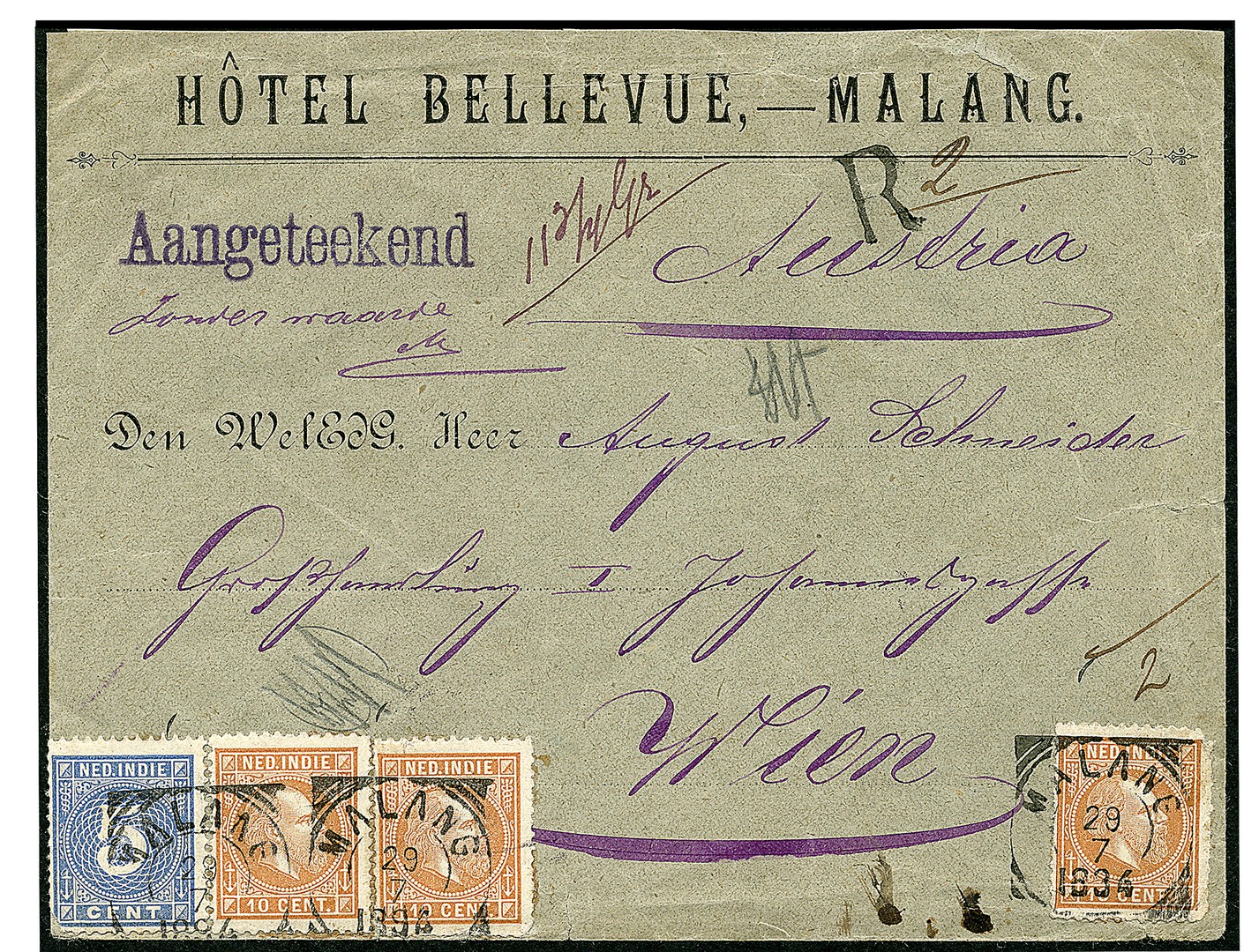 OOSTENRIJK-HONGARIJE. 10 Cent nr. 9K en 5c nr. 22D (fraaie zegels) op couvert van het 'Hôtel Bellevue' van 11¾ gr. op 29-7-1894 aangetekend via Soerabaja en Weltevreden 1-8 naar Wenen