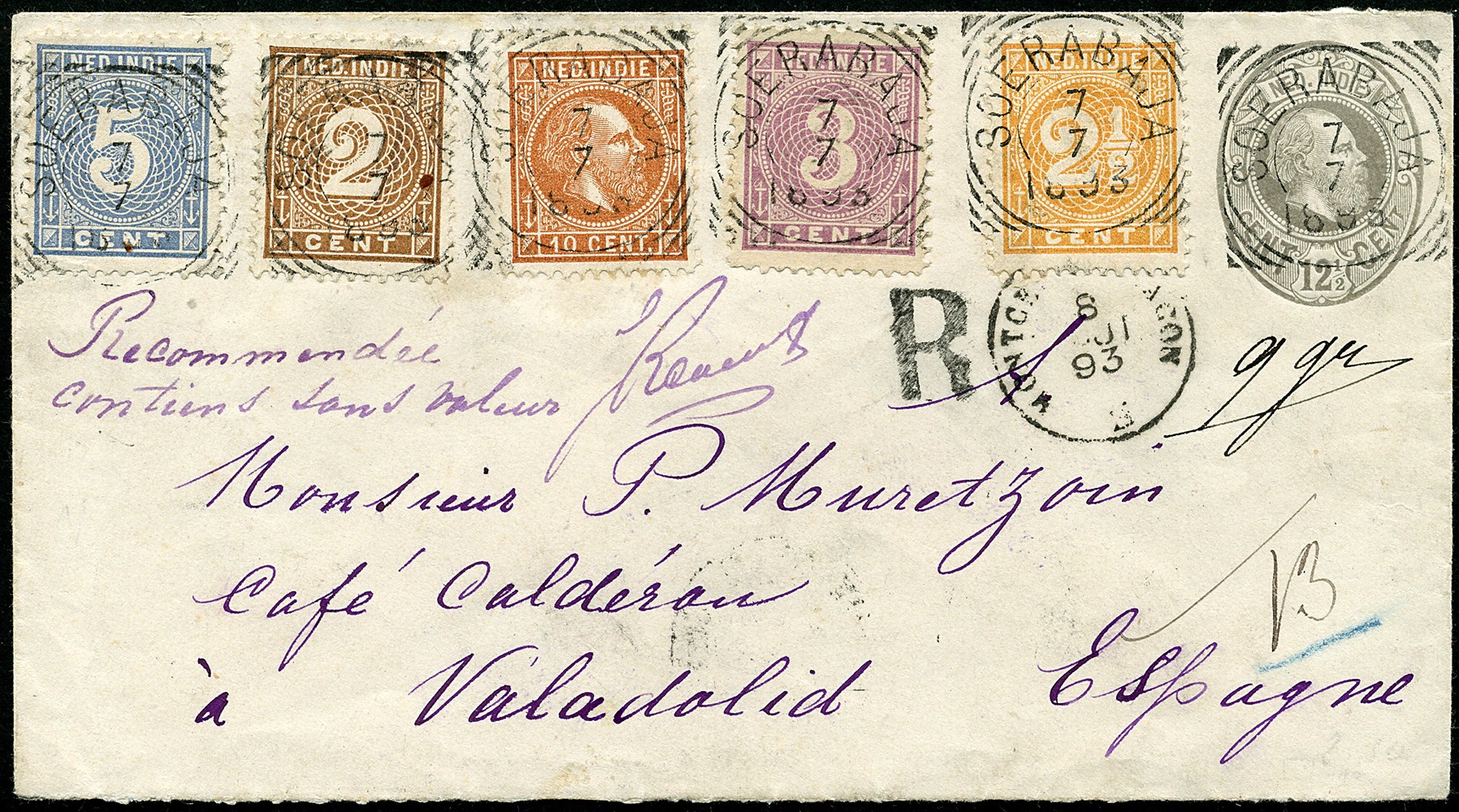 SPANJE. 10 Cent nr. 9K, 2c nr. 18D, 2½c nr. 19D, 3c nr. 20D en 5c nr. 22Da op env. G7 van 9 gr. aangetekend van Soerabaja 7-7-1893 via Weltevreden en diverse Franse spoorwegtrajecten naar een café te Valladolid 11-4. Mooie 6-kleurenfrankering, alle zegels keurig afgest.