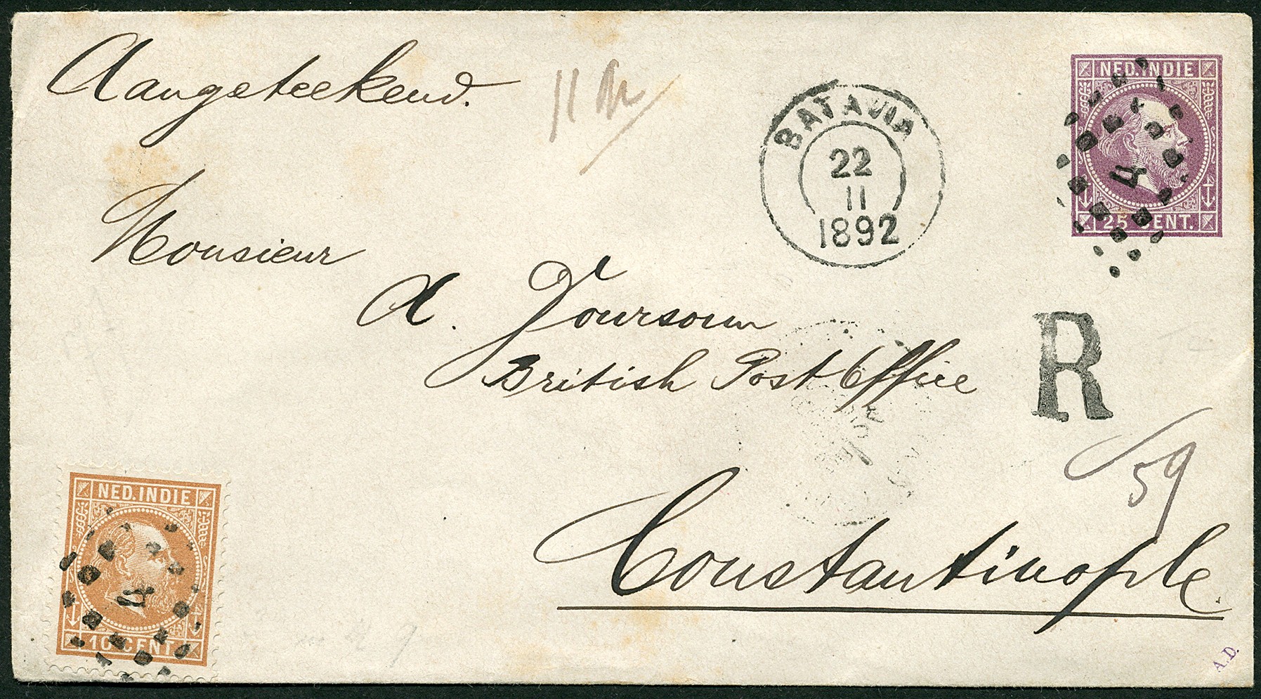 TURKIJE. 10 Cent nr. 9F op env. G3 van 11 gr. aangetekend van Batavia 22-11-1892 via Constantinopel 24-12 naar het Britse postkantoor aldaar, in het Europese deel van het Ottomaanse Rijk. Zeldzame bestemming!