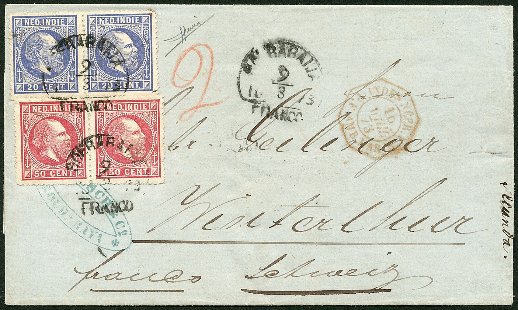 ZWITSERLAND. 20 Cent nr. 12A in paar (daarnaast handtekening als keurmerk) en 50c nr. 15A in paar op zeer frisse briefomslag van de 2e gew. klasse (met rood potlood '2') van Soerabaija 9-3-1873 (type halfrond-franco) met de Franse pakketboot via Suez, rood stempel 'Indes Néer.V.S. / P.F.Amb.Mar.' (Salles 1.892) 16-4 naar Winterthur 28-4. Oogstrelend prachtstuk. Ex Voerman. Zie: Filatelie feb. 2016, blz. 116