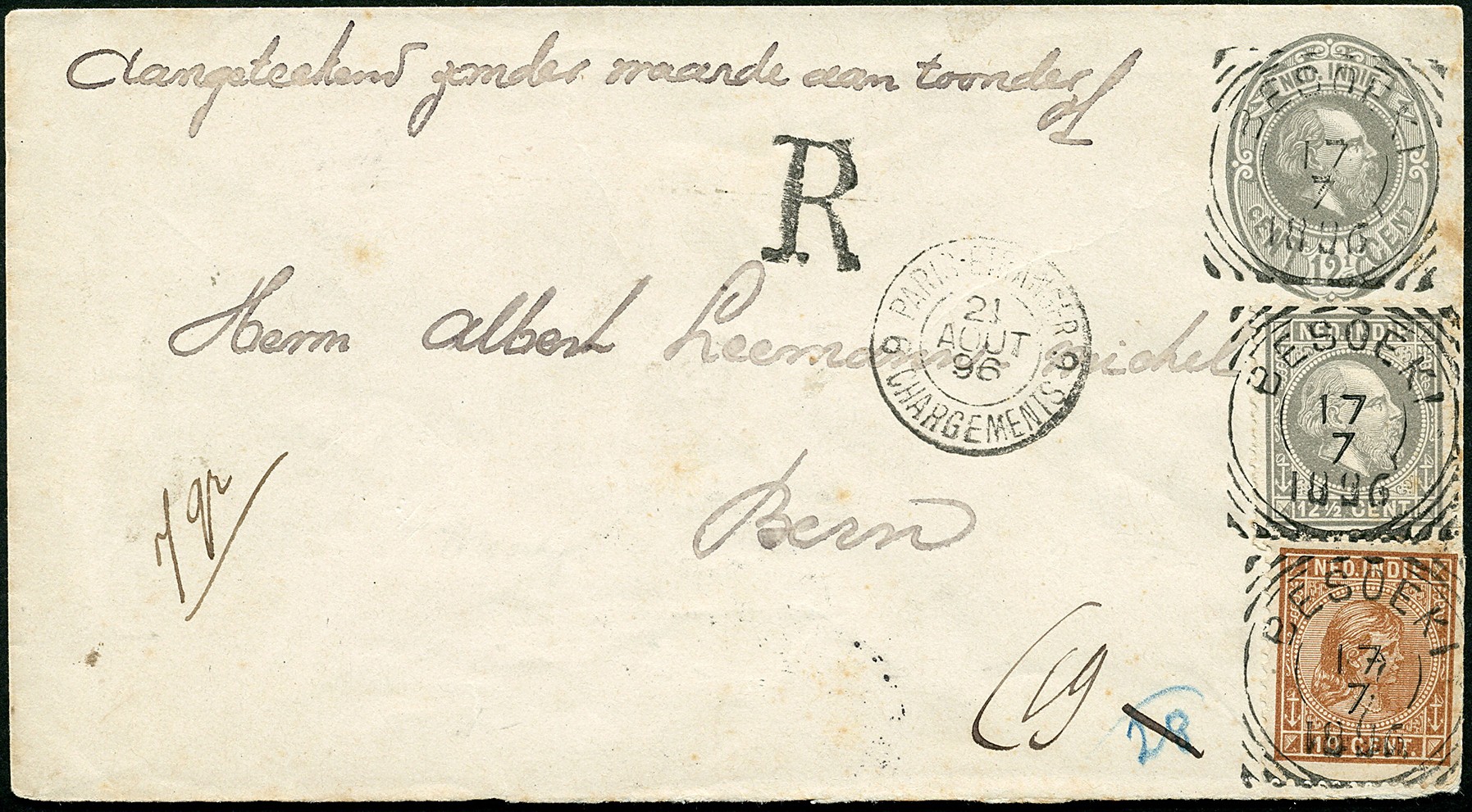 ZWITSERLAND. 12½ Cent nr. 10H en 10c nr. 23 (beide vr. prachtex.) op env. G7 van 7 gr. aangetekend van Besoeki 17-7-1896 via Soerabaja en Weltevreden over Parijs 21-8 naar Bern 22-8. Aardige mengfrankering
