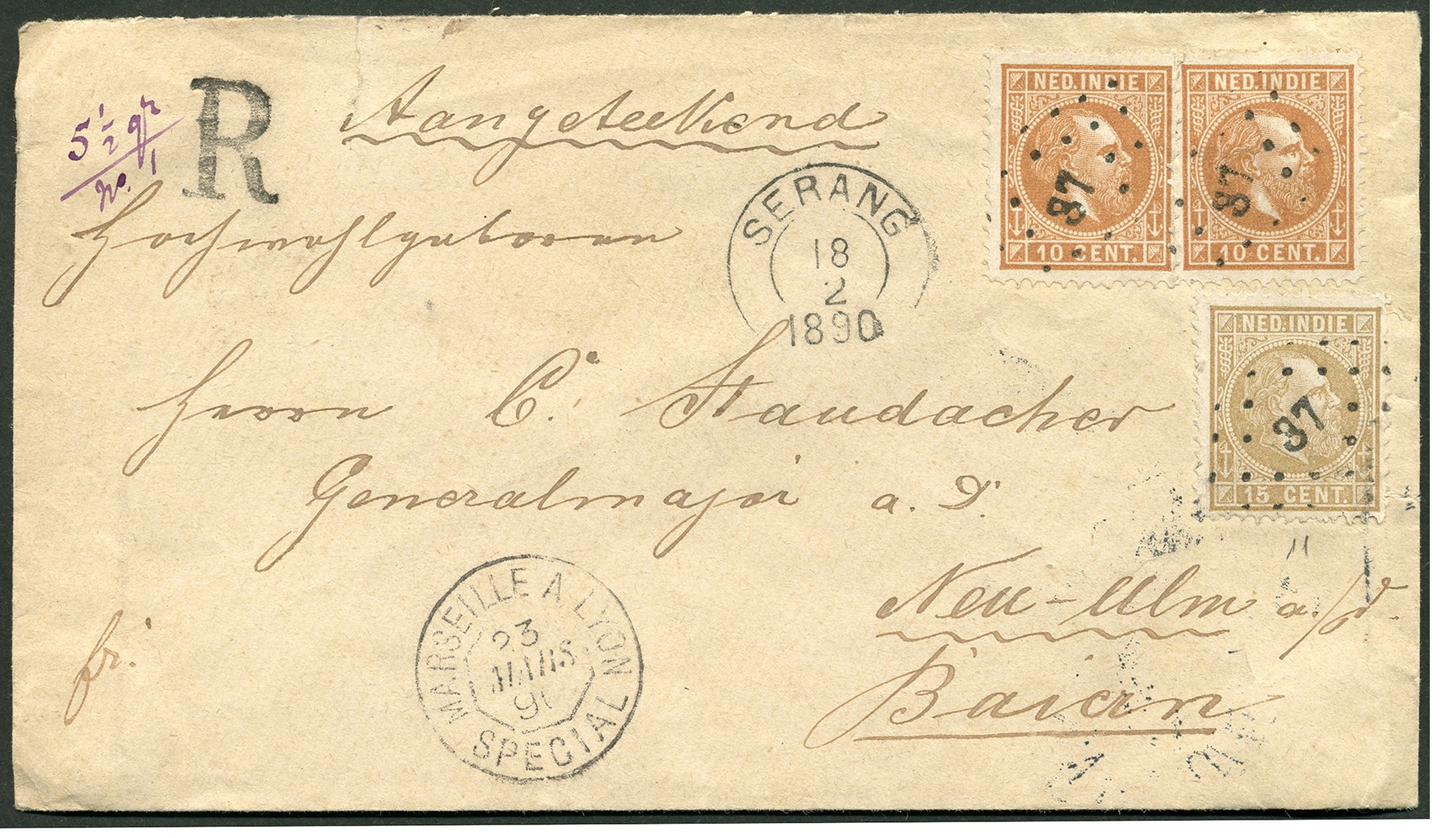 Puntstempel 37. Env. van 5½ gr. gefr. met 10c nr. 9F (2x) en 15c nr. 11F (vr. prachtex.) aangetekend van Serang 18-2-1890 via Marseille 23-3 naar Neu Ulm 25-3 met op az. een weelde aan doorgangsstempels