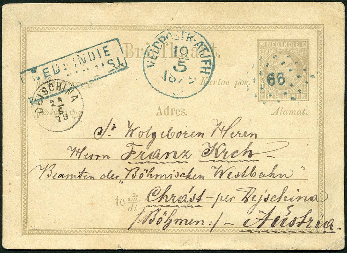 Puntstempel 66. Bk. G3 op 17-5-1879 te velde geschreven in de 'Tjot Bosotoei' via Veldpostk.Atjeh 19-5 over Brindisi naar Deischina 29-6 in Oostenrijk-Hongarije. Zeer zeldzame bestemming!
