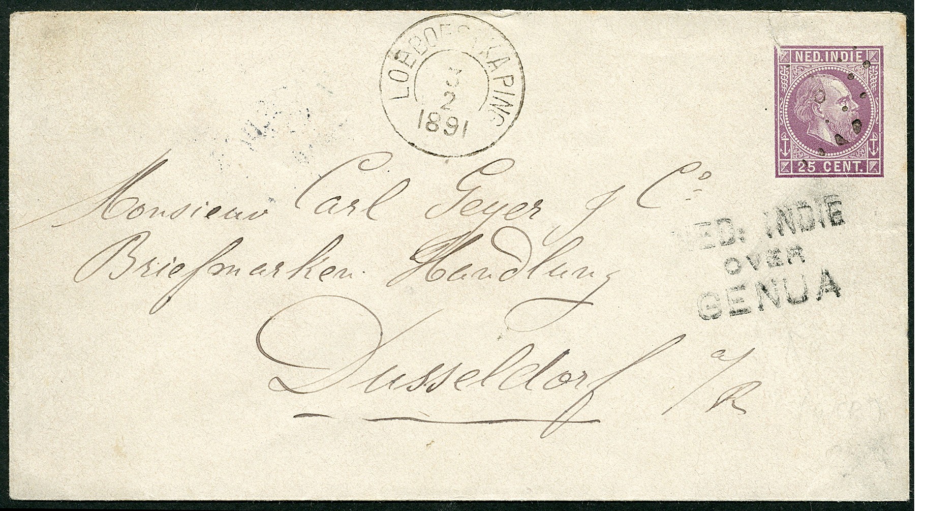 Puntstempel 81. Env. G3 van Loeboesikaping 3-2-1891 via Padang 5-2 over Genua 12-3 naar Düsseldorf 13-3. Lichte afdruk puntstempel en zeer goed leesbare afdruk van het zeldzame kleinrondstempel (SvL 300)