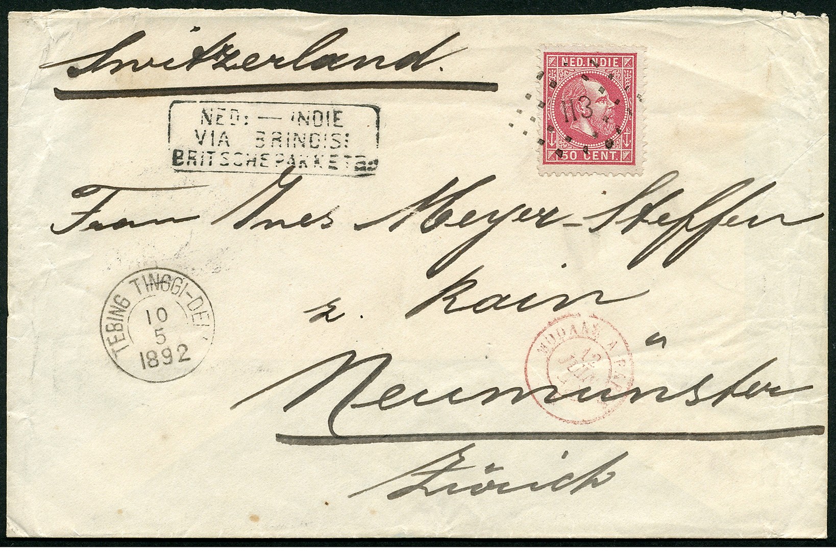 Puntstempel 113. 50 Cent nr. 15F op env. in de gew. klasse 15-30 gr. van Tebing Tinggi-Deli 10-5-1892 via Medan en de N.I.Postagent Penang 14-5 over Brindisi en traject Modane à Paris 12-6 naar Neumünster 13-6. Prachtige afstempelingen!