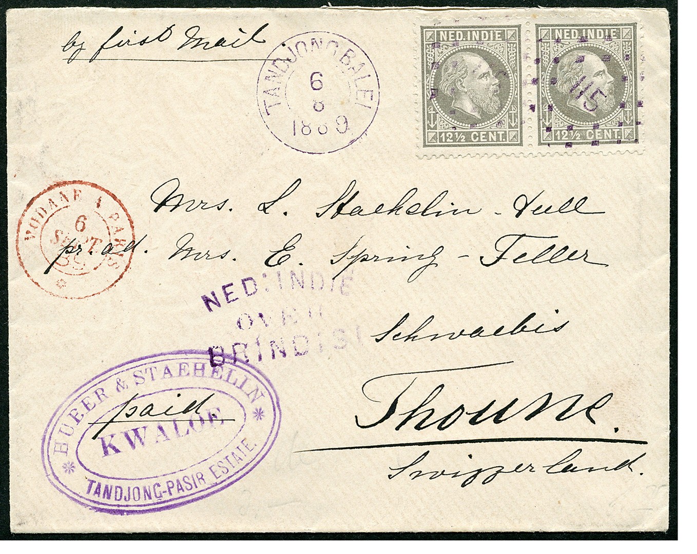Puntstempel 115. 12½ Cent nr. 10H in paar (rechtsboven rond hoekje) op mooi couvert van een cultuuronderneming van Tandjongbalei 6-8-1889 via de Ned.Ind.Penang 10-8 over Brindisi en per traject Modane à Paris naar Thun 7-9. Prachtig couvert met mooie afstempelingen in violet