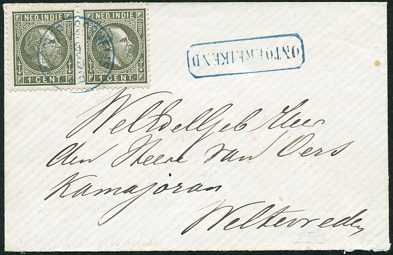 1 Cent nr. 4E in prachtpaar op klein envelopje van Meester-Cornelis 9-10-1887 naar Weltevreden 9-10 (maandcijfers kopstaand). Het drukwerktarief is weliswaar 2 cent, maar dat het een drukwerk betreft is door de afz. niet aangegeven op het dichtgeplakte couvert, wellicht daarom afgest. 'Ontoereikend'. Schaars poststuk!