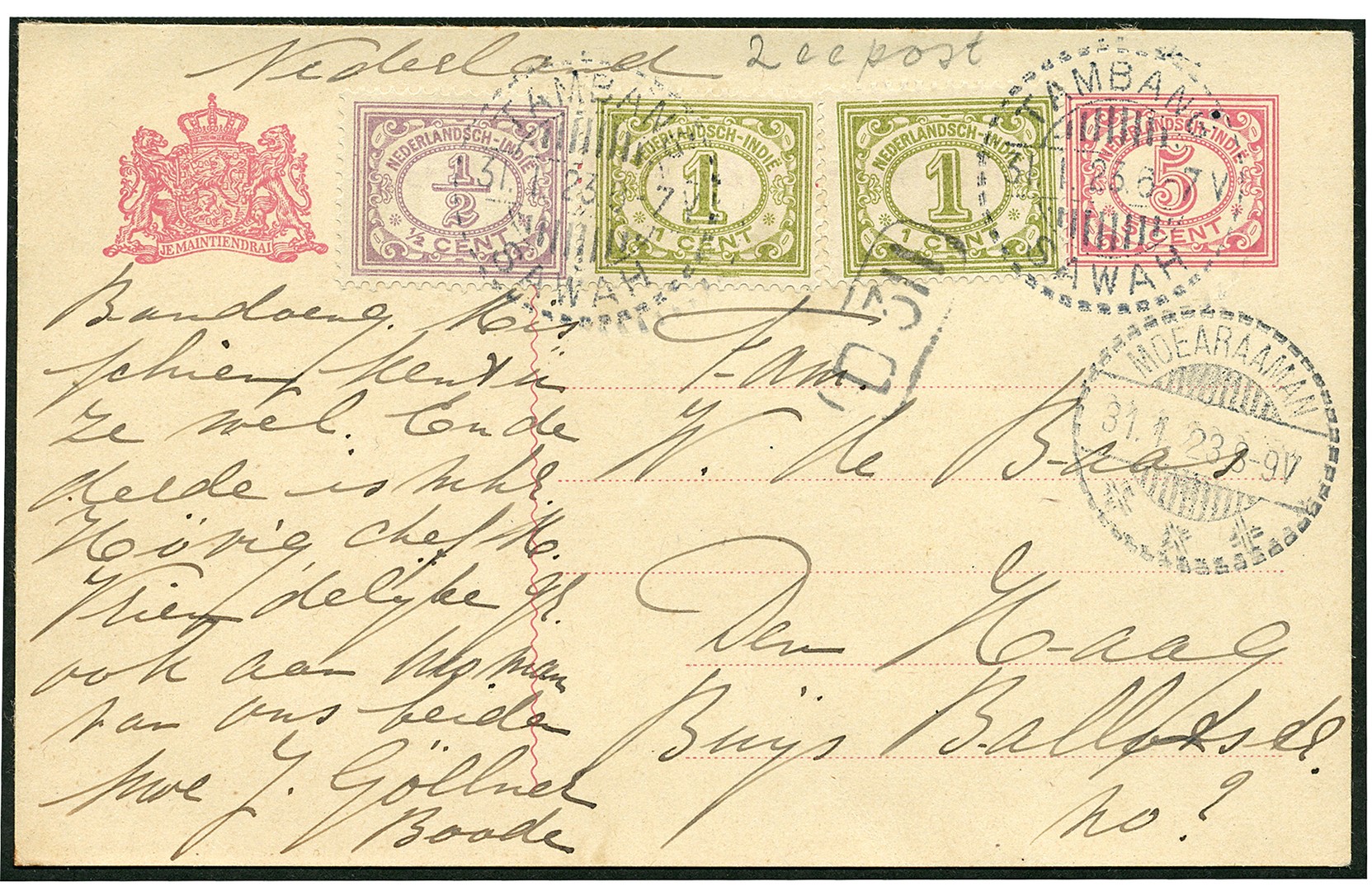 Bk. G27 bijgefr. met ½c en 2x 1c, 2x prachtig afgest. TAMBANG / SAWAH 31-1-1923 via Moearaaman 31-3 naar Den Haag. Schaarse langebalk (SvL 225)