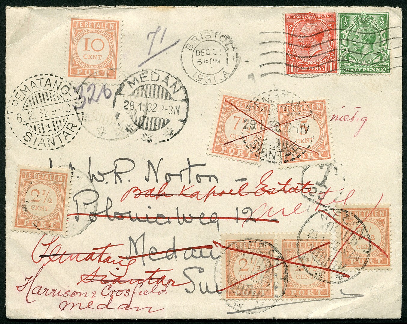 Beport. Env. uit Bristol 31-12-1931 op zoek naar de geadresseerde in Deli, 2x tevergeefs beport en nietig verklaard, uiteindelijk toch weer beport in Medan 6-2, op az. o.a. 'soeda pigi kebon' (al vertrokken naar de tuin = cultuuronderneming)