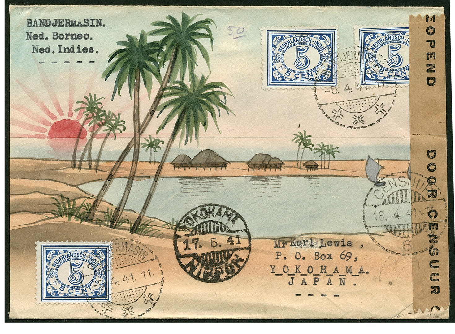 5 Cent cijfer nr. 272 uit 1941 als enkelfrankering op 2 locale env. (Solosriwedari, Bataviacentrum) en 3x op prachtig met waterinkt verfraaid couvert van Bandjermasin 5-4-1941 naar Yokohama