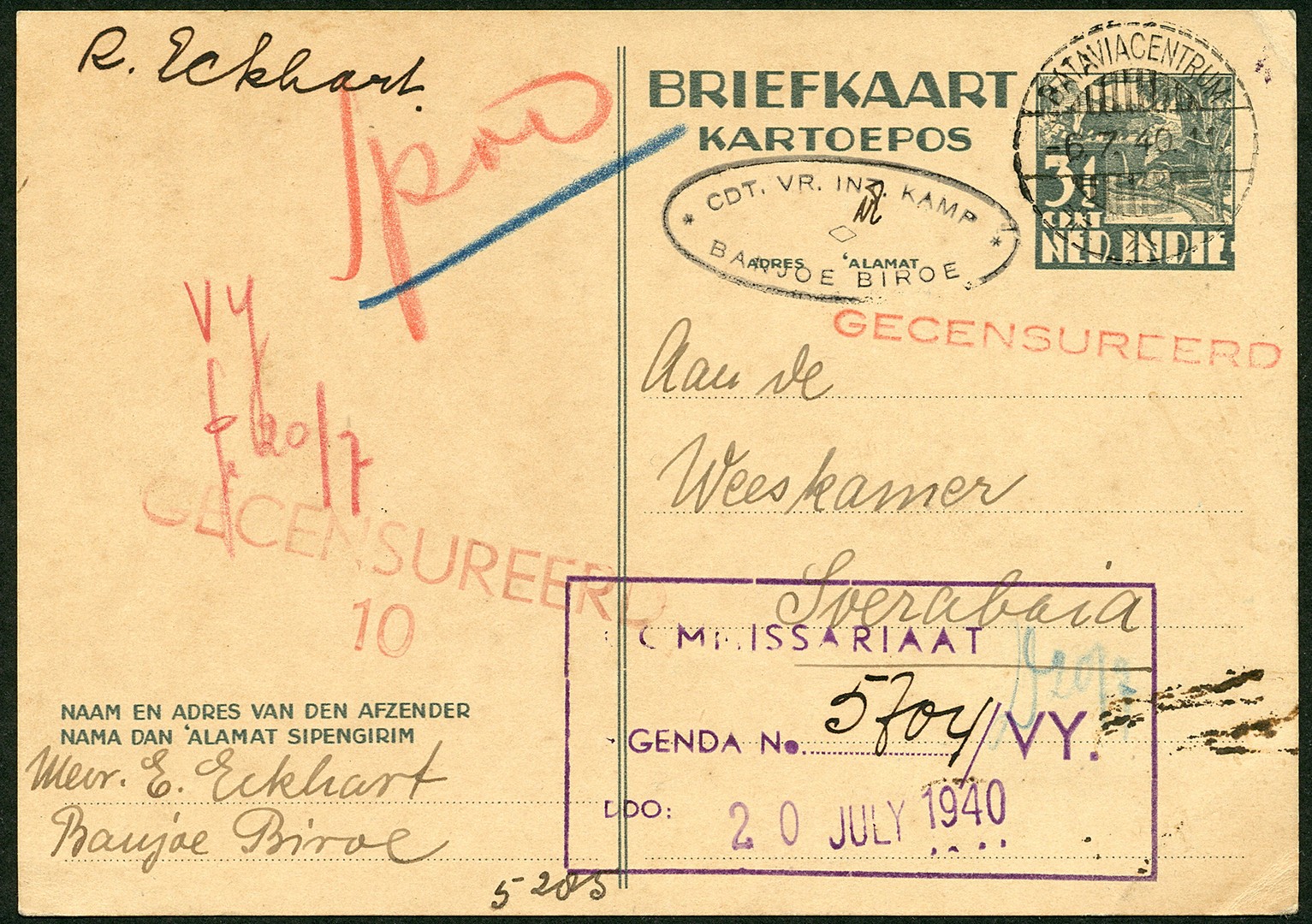Interneringskampen. Ovaalstempel 'CDT. VR. INT. KAMP / BANJOE BIROE' (deW.KI CO, bk. geschreven op 3 juli) op gecensureerde bk. via Bataviacentrum 6-7-1940 naar Soerabaja