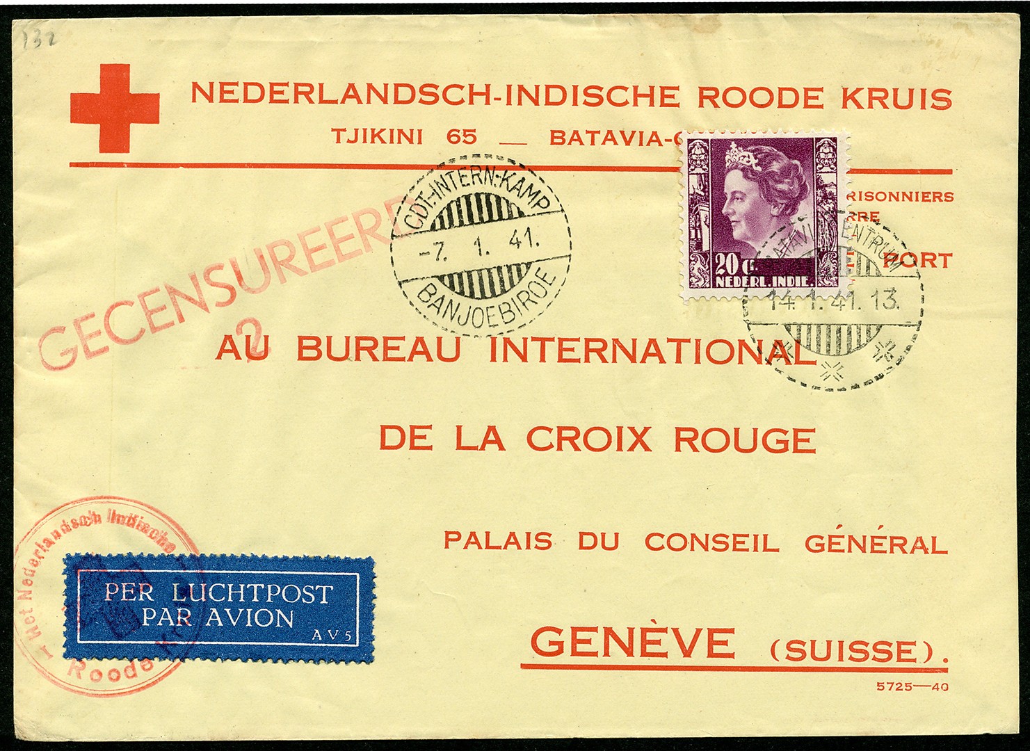 Interneringskampen. Kampstempel 'CDT.-INTERN.-KAMP / BANJOEBIROE' -7.1.41 (deW.KI CR) op speciaal gecensureerd couvert waarop 20c voor luchtrecht via Bataviacentrum 14-1 naar Genève