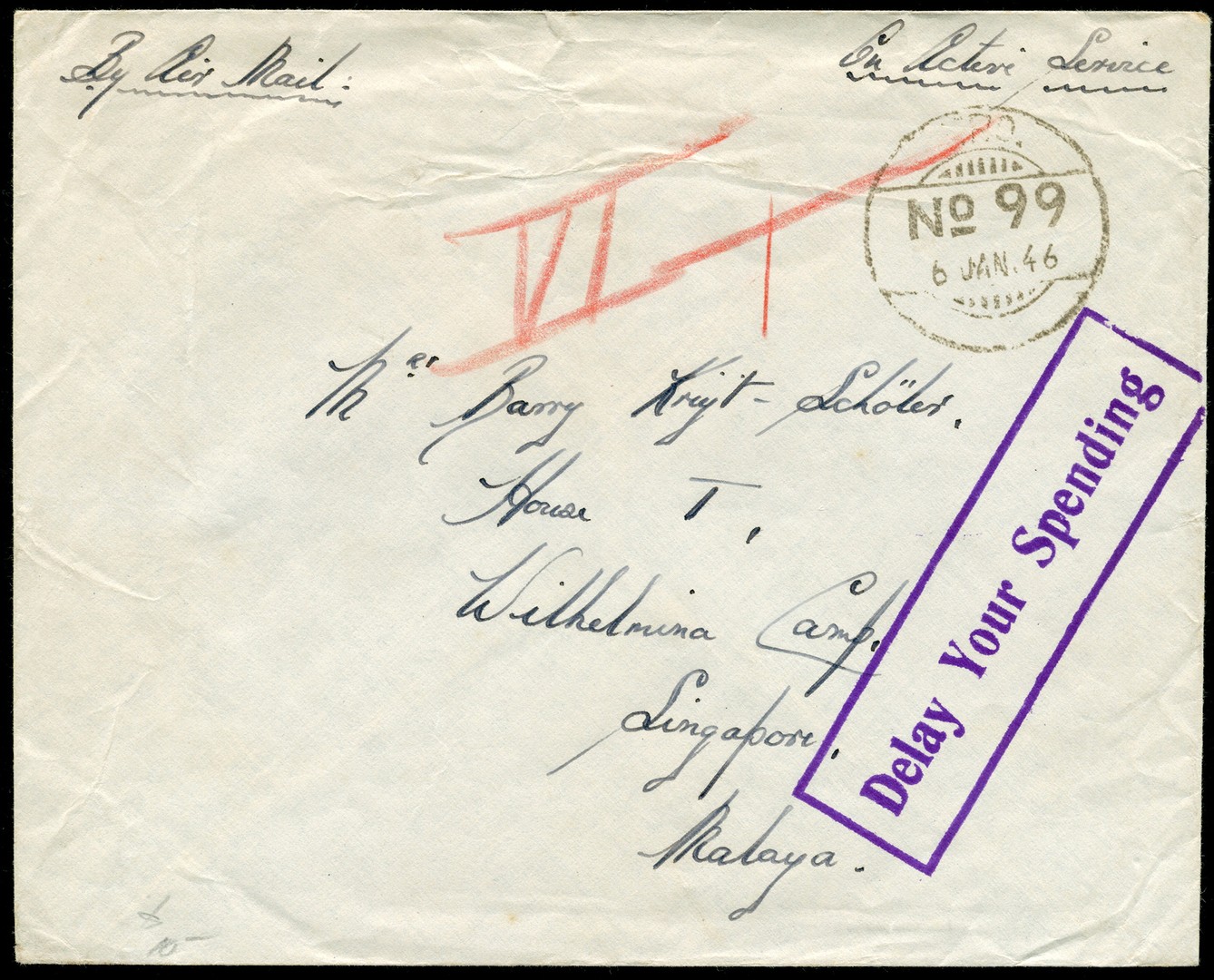 Prachtige afdruk 'Delay Your Spending' in violet op portvrije env. met F.P.O. No. 99 6-1-1946 van het Indiase leger te Batavia naar het Wilhelminakamp te Singapore