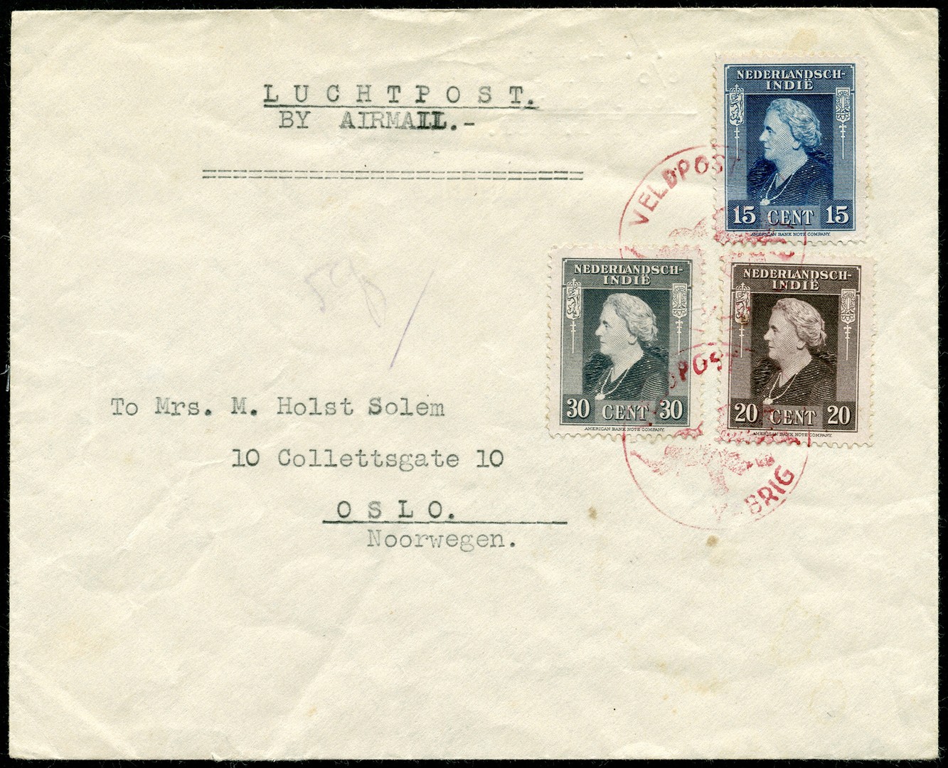 Veldpost. Rode Olifant. Couvert met stempel van 'Veldpost Denpasar' naar Batavia-C. 3-6-1946, couvert met 'Veldpost Y-Brig' uit Palembang, alsmede couvert gefr. met 15c, 20c en 30c afgest. met 'Veldpost Y-Brig' uit Denpasar met bestemming Oslo