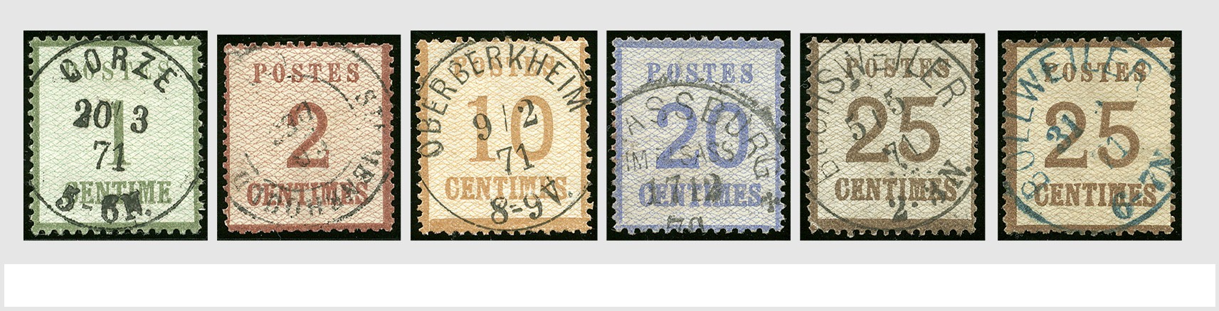 ELSASS-LOTHRINGEN 1870, 45 Einzelmarken/Briefstücken, dabei Mi.Nr. 1Ia, 2Ia, 2IIa, 7Ib, 7IIa und 7IIb, alle gestempelt und meist kompetent signiert mit 4 Befunde, weiterhin noch 16 Entwertungen Elsass-Lothringen auf DR.-Marken.Gute Erhaltung