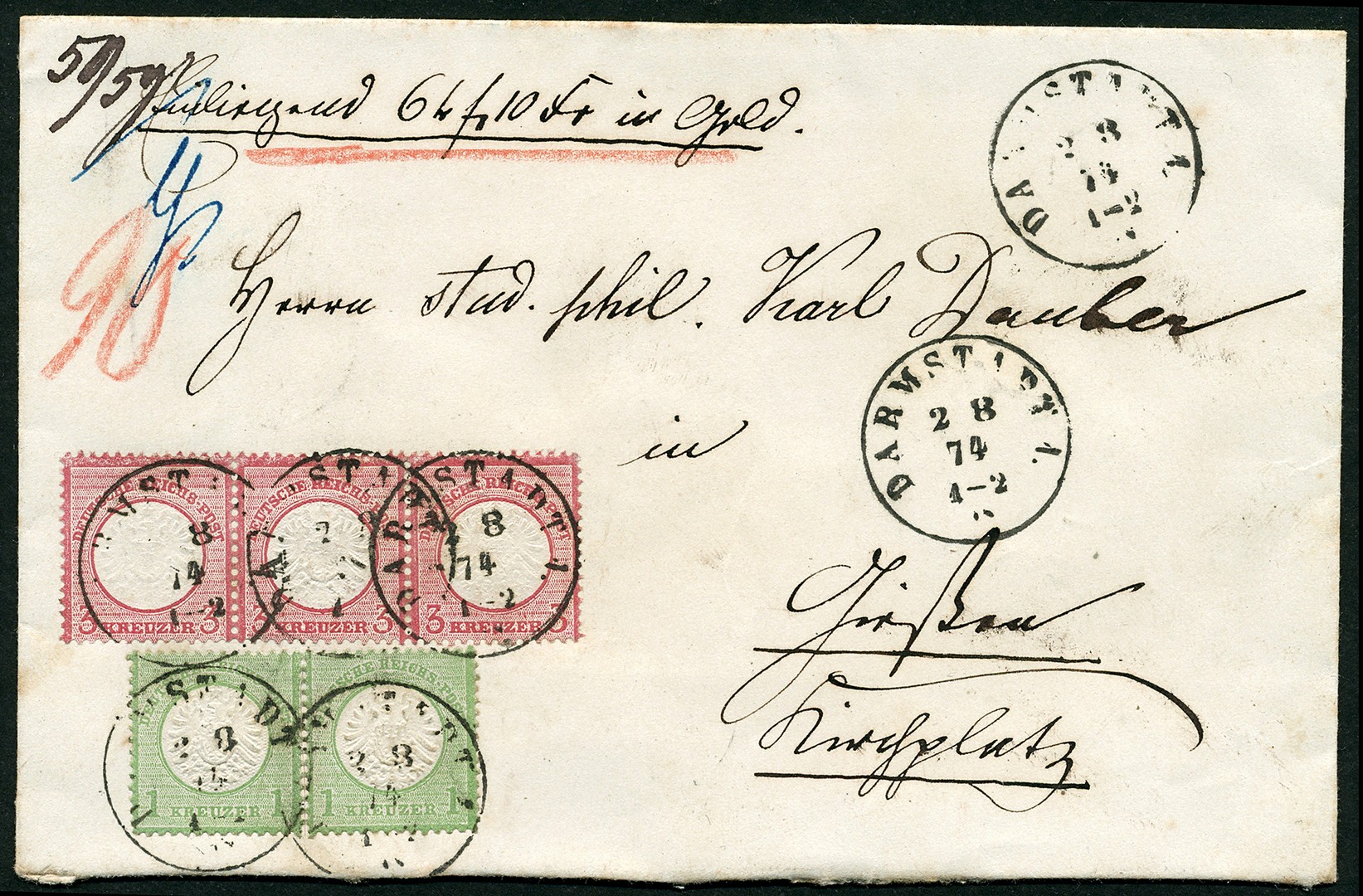 DEUTSCHES REICH 23, 1 Kreuzer gelbgrün im waagr. Paar und Nr.25, 3 Kreuzer karmin im waagr. Dreierstreifen, alle farbfrisch und gut geprägt mit EKr. "DARMSTADT 2 8 74" auf Wertbrief nach Jungfrau (Schweiz). Ungewöhnliche Frankatur. Pracht