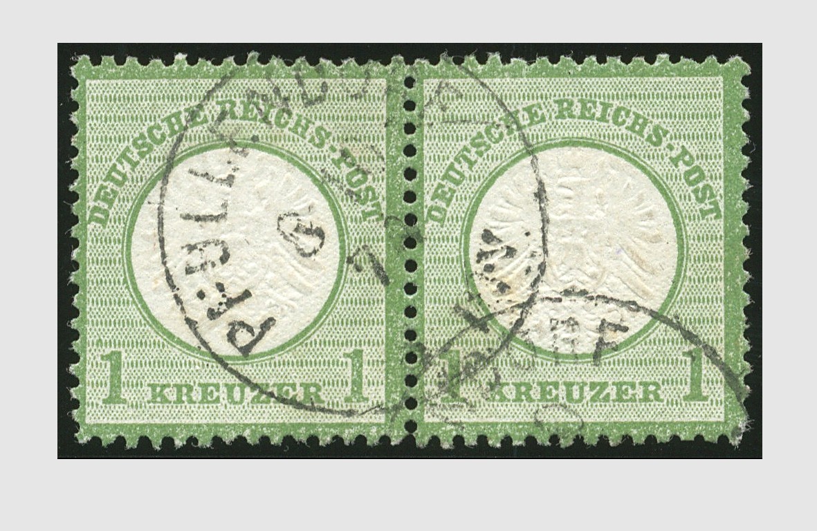 DEUTSCHES REICH 23b(2), 1 Kreuzer dunkelgrün, Grosser Schild, im waagerechten Paar, farbfrisch, einwandfrei zentriert und gut gezähnt mit EKr. "PFULLENDORF 8/../73". Bis auf kleinen Fleck im rechten Marke, ein seltenes Paar in der b-Farbe mit Fotoattest Sommer BPP (2003) € 1600,=