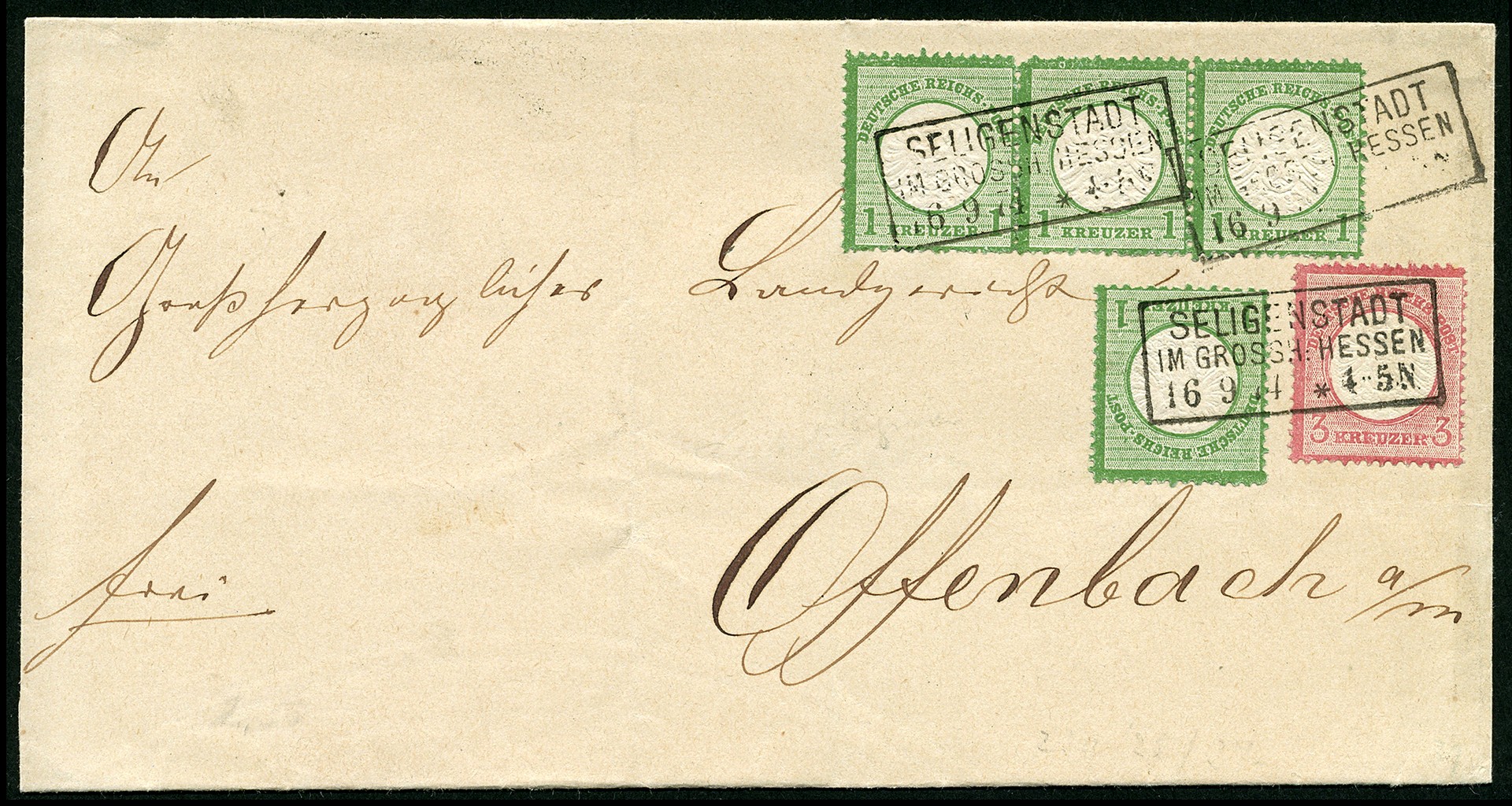 DEUTSCHES REICH 23b, 1 Kreuzer dunkelolivgrün im waagr. Dreierstreifen und Einzelmarke, zusammen mit Nr.25, 3 Kreuzer rötlichkarmin, entwertet mit Ra3 "SELIGENSTADT IM GROSSH:HESSEN 16.9.74" auf Faltbrief nach Offenbach, in durchschnittlicher Erhaltung mit Farbfotoattest Krug BPP (2006)
