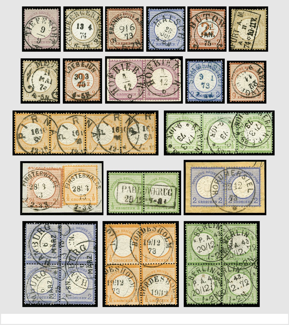 DEUTSCHES REICH 1872-1875, Grosser Brustschild, Mi.Nr. 16-30, nach Stempel gesammelt, dabei Einzelmarken/Briefstücke, Paare, Streifen, 4er-Blöcke und 15 Briefe/Karten, in meist hervorragender Qualität, dabei vieles geprüft oder mit Befund/Attest. Schönes Objekt mit riesigem Katalogwert