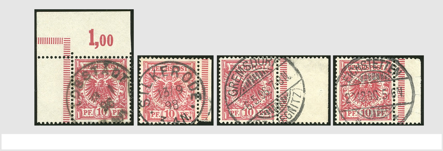 DEUTSCHES REICH Mi.-Nr. 47, 10 Pf. rosarot, gestempelte Teil-Rekonstruktion der Bogenränder, dabei drei Eckränder, in schöner Qualität