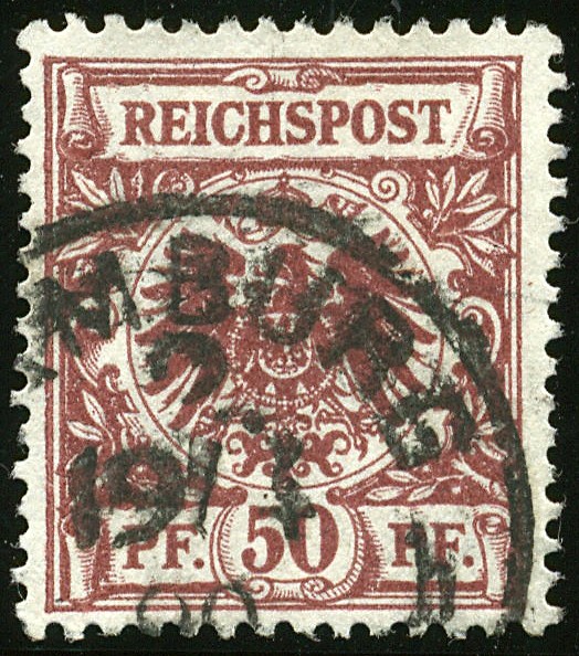 DEUTSCHES REICH Mi.-Nr. 50aa, 50Pf. weinrot, vollzähnig, gut zentriert, farbfrisch und vollkommen einwandfrei mit Stempel "(HA)MBURG2 19.4.90" und Befund Zenker BPP € 2000,=