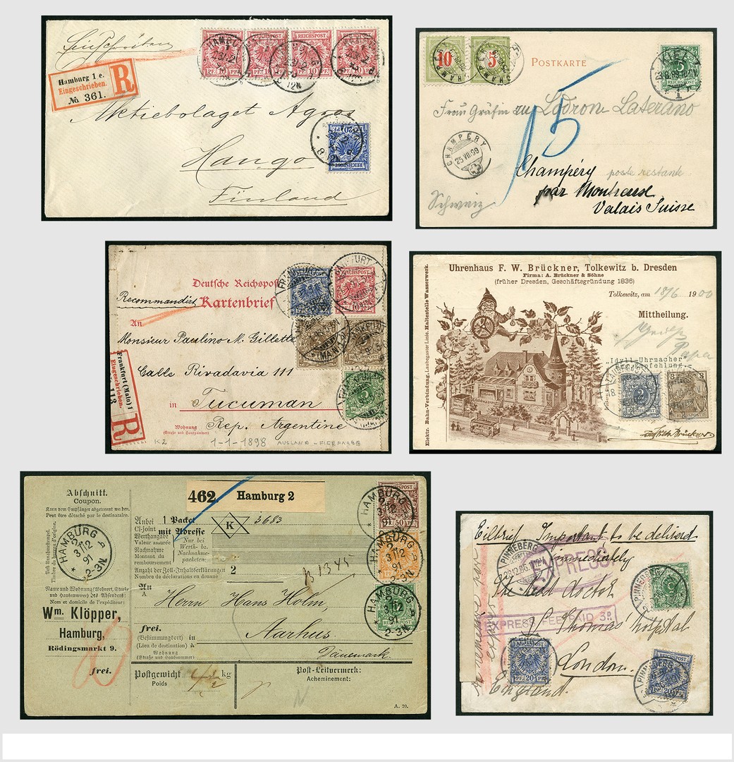 DEUTSCHES REICH 1889-1900 "Krone-Adler", Sammlung mit über 500 Briefen/Karten, dabei EF, MiF und MeF, Plattenfehler, Farbnuancen und gute Auslanddestinationen wie z.b Hawaii, NL-Indien, Japan, Indo-China usw., auch gute Wertbriefe und Rohrpostkarten. Schöne Sammlung in 4 Alben
