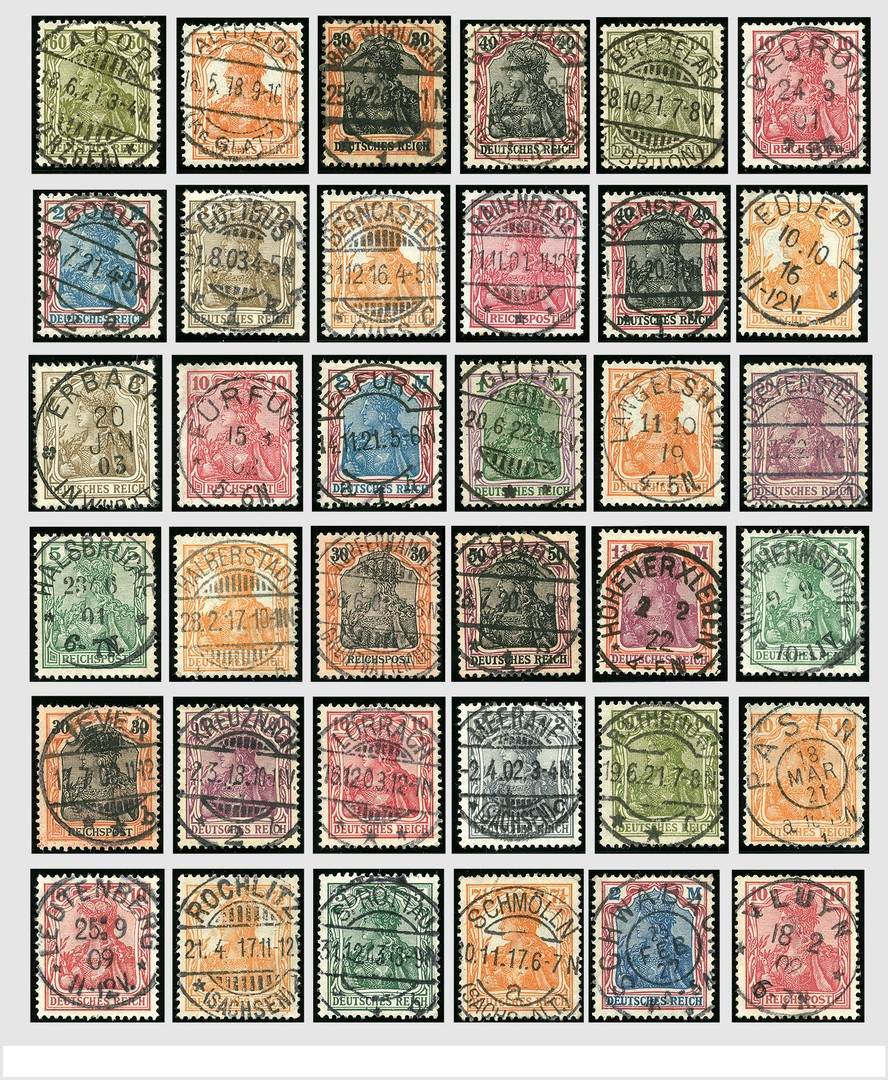 DEUTSCHES REICH Germania, sehr umfangreiche Stempel-Sammlung, alphabetisch sortiert, von Aachen bis Zwickau, tausende Marken/Briefstücke und einige Briefe/Ganzsachen. Schönes Objekt in guter Erhaltung, in 7 Alben