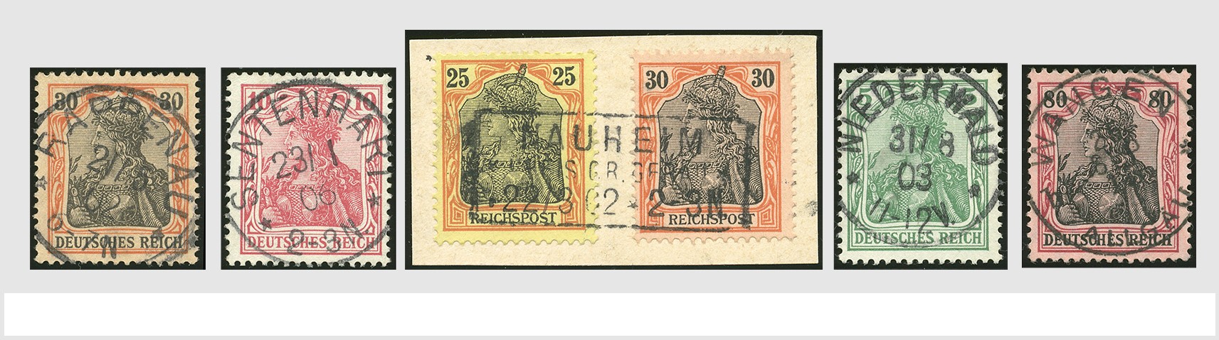 DEUTSCHES REICH Germania, Stempelsammlung mit über 650, fast nur kompl. Abstempelungen, teils auf Briefstücken, dabei viele bessere Stempel, und 35 Briefe/Karten in 2 Einsteckbücher