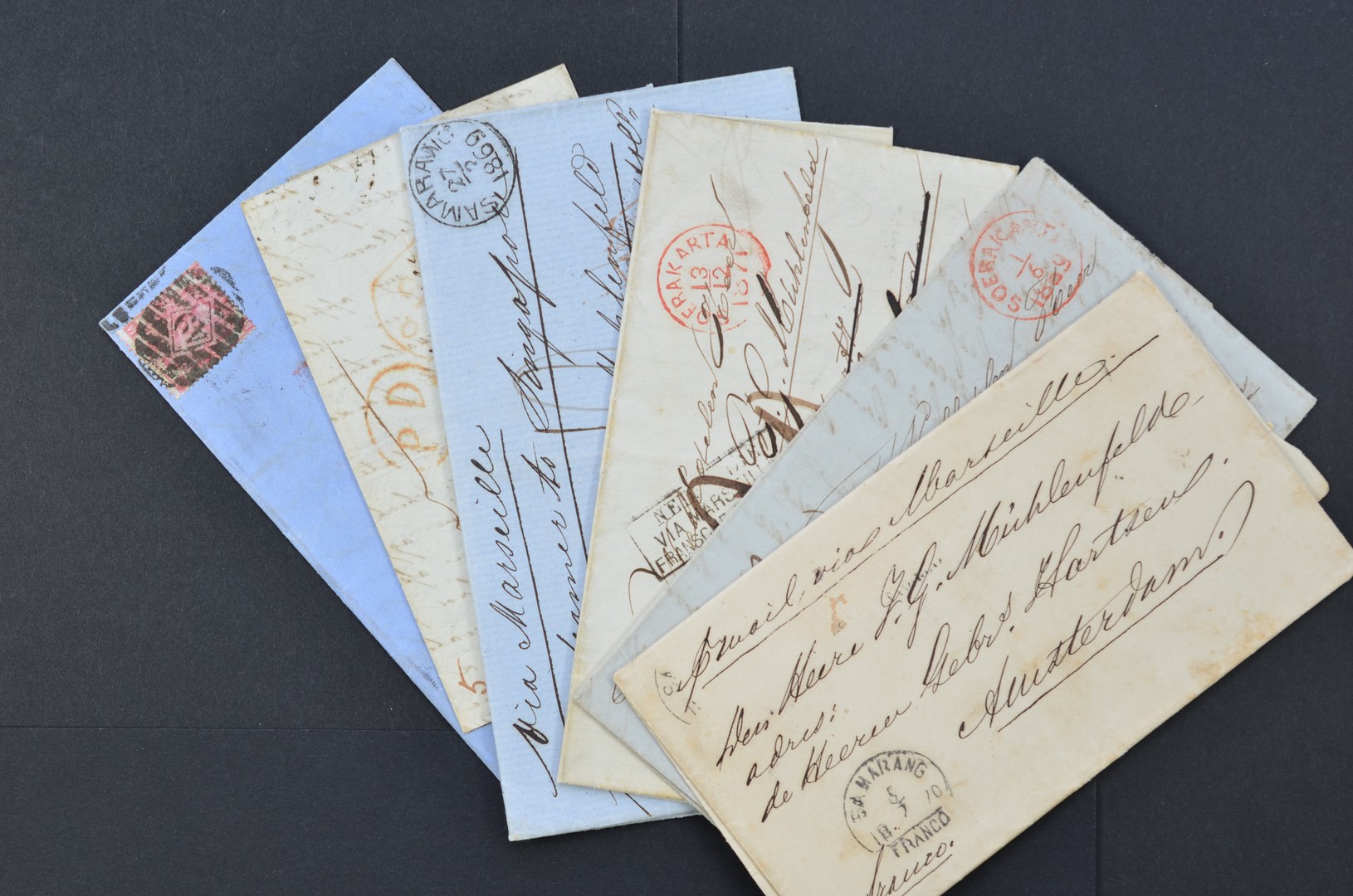 NED.- INDIË POSTHISTORIE. 4 Vouwbrieven 1869-71 (1 ex. zegels verwijderd), alsmede 2 uit Engeland (1845, 1867)