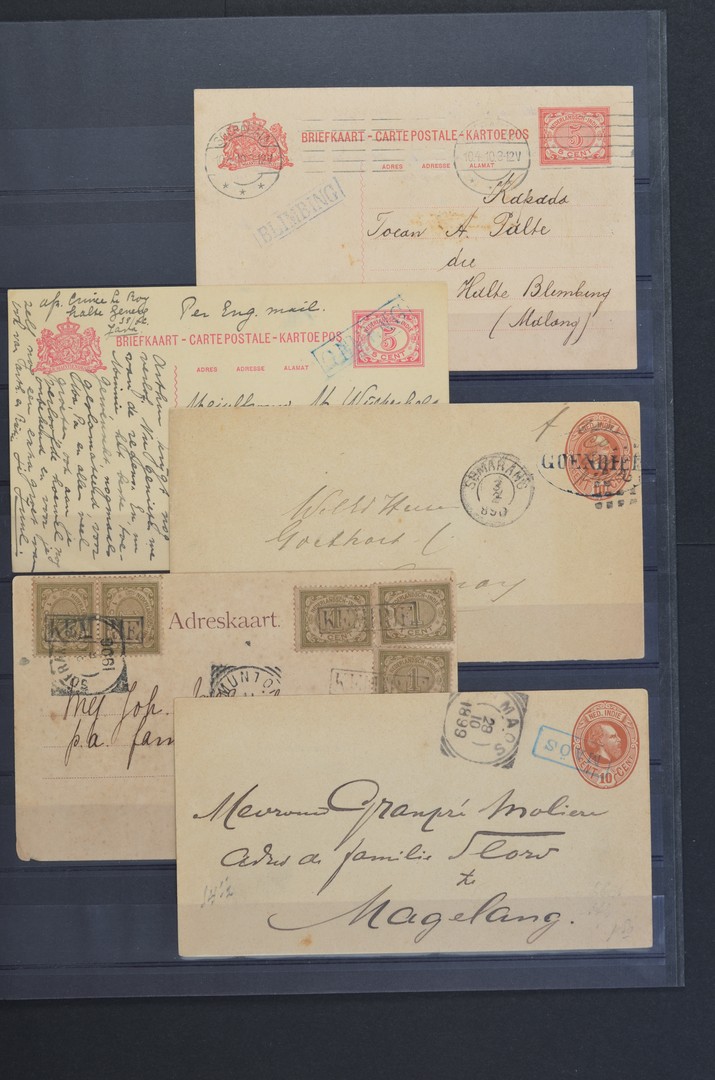 NED.- INDIË POSTHISTORIE. Haltestempels. 13 Poststukken 1890-1917 met haltestempels w.o. Blimbing (1917), Goendieh ovaal (1890), Kemirie (1906)Melangbong (1902), Papar (1893), Tjigombong (1896, 1904), alsmede prentbk. halte Djamboe