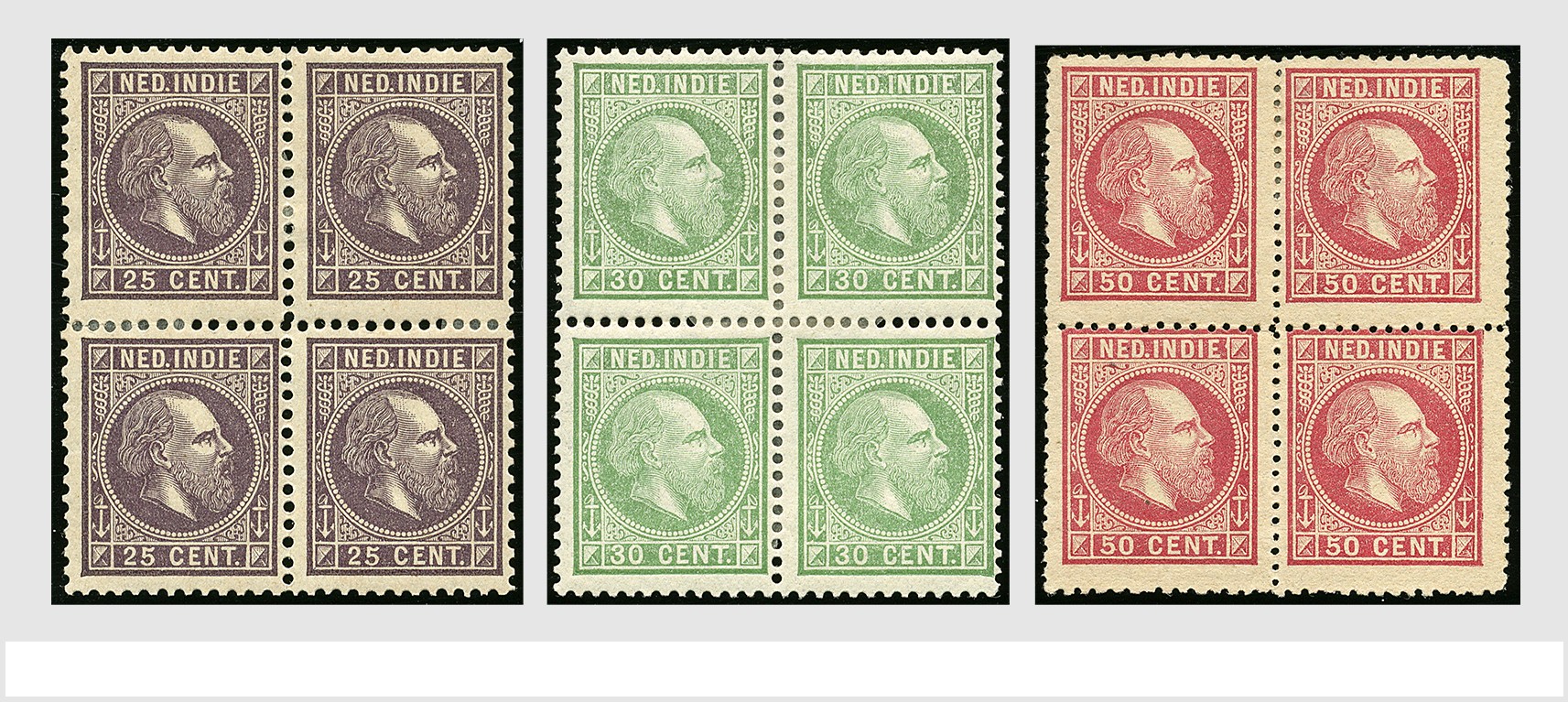 NED.- INDIË, emissie 1870 in ongebruikte blokken van 4, w.o. 11C, 13Fa, 14K, 15A enz., tevens 13C in blok van 8 (roestvlekjes)