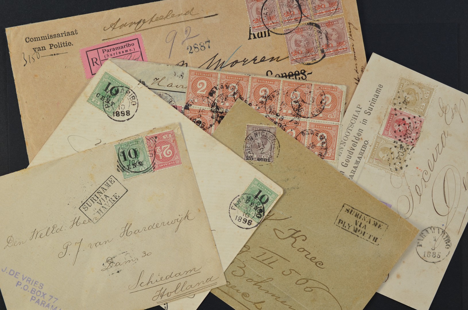 SURINAME POSTHISTORIE. 16 Poststukken (2 voorzijden) 1885-1912 w.o. aardige (enkel)frankeringen en 4 aangetekend