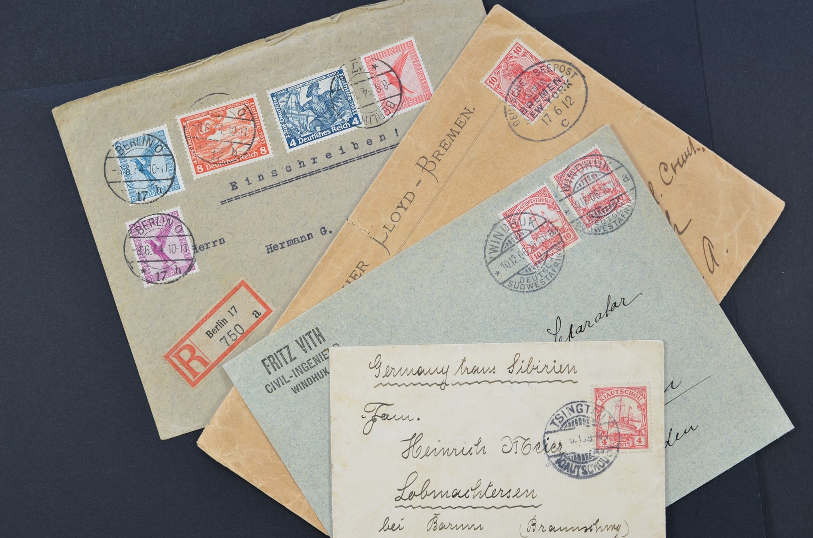 DUITSE RIJK. Partijtje poststukken w.o. met gelegenheidsstempels alsmede zeppelinpost, en 2 enveloppen uit Tsingtau en Windhuk