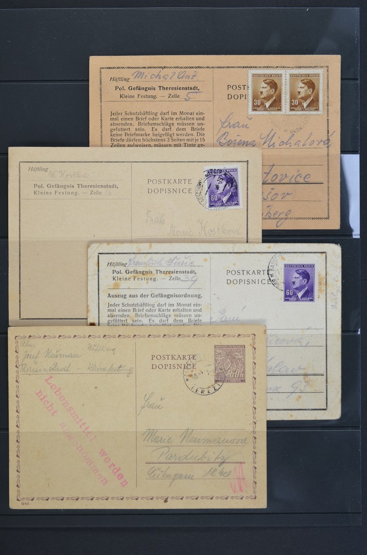 TWEEDE WERELDOORLOG. Vier verschillende briefkaarten van Joodse gevangenen uit het concentratiekamp Theresienstadt, Kleine Festung, waarvan een met rood stempel 'Lebensmittel werden nicht angenommen'