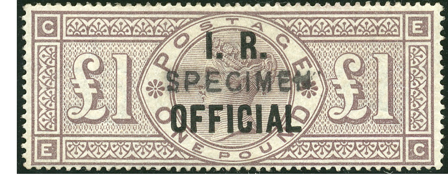 ENGELAND, 1 Pond bruin-lila, letters EC, met 'I.R. OFFICIAL' opdruk en 'specimen', S.G.011 (specimen), mooi ongebruikt exemplaar, schaars zegel!