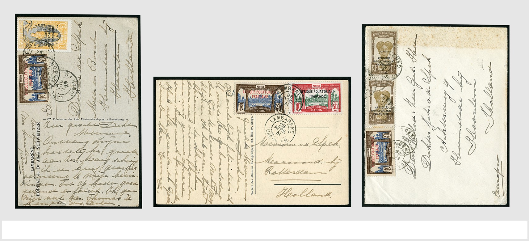 MOTIEF bekende personen: Albert Schweitzer 1929-1931, 3 briefkaarten en brief verzonden vanuit het hospitaal in Lambaréne in Frans Equatoriaal Afrika, door Albert Schweitzer gericht aan Dr. v/d Spek in Heemstede