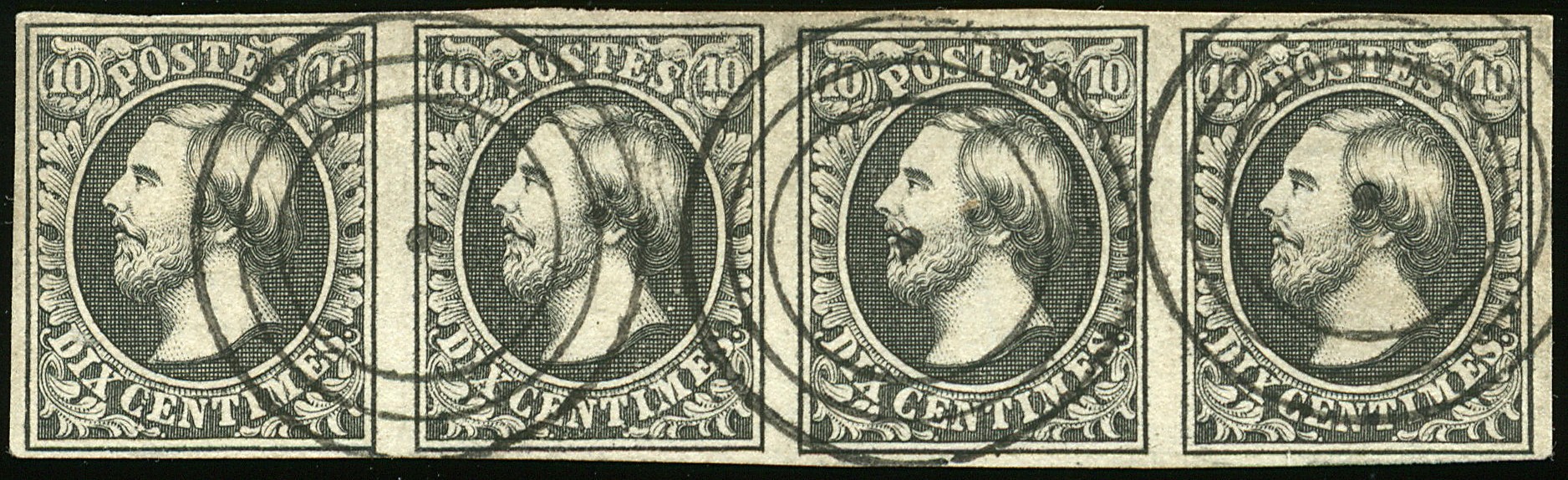1b, 10 cts. 'noir légèrement verdâtre', bande de quatre, oblitération centrale trois cercles de Luxembourg (ex. collection Rhein), Superbe! 1b, 10 cts. 'leicht grünlichschwarz', zentral entwertet mit Dreikreisstempel von Luxembourg, (ex. Sammlung Rhein), Luxusstück! Sign. Goebel