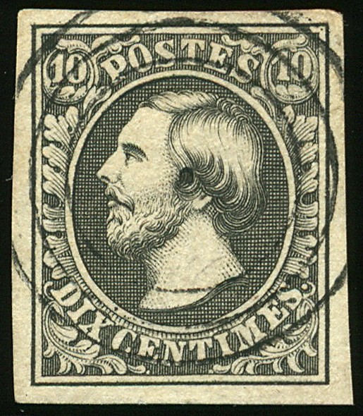 1b, 10 cts. 'noir légèrement verdâtre', 1er tirage, oblitération centrale 3 cercles, TB. 1b, 10 cts. 'leicht grünlichschwarz', 1. Ausgabe zentral entwertet mit Dreikreisstempel, Pracht. Sign. Goebel