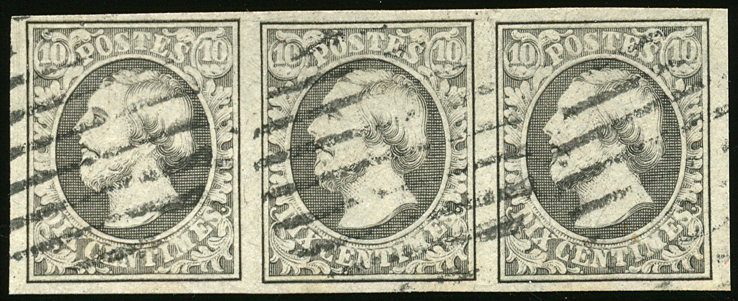 lj centimes 'gris noir', bande de trois, oblitération 9 barres de Luxembourg, TB 1j, 10 cts 'schwarzgrau', Dreierstreifen entwertet mit 9-Balkenstempel von Luxemburg-Stadt. Prachtstück.