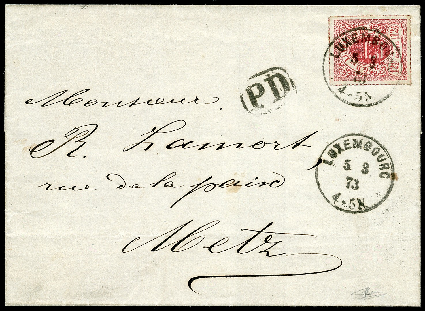 BUREAU DE LUXEMBOURG-VILLE, Mi.18, 12½ centimes 'carmin', sur Lettre pour Metz, oblitération c.à.d. LUXEMBOURG 5/3/73, nuance éclatante, avec le rare cachet bleu au verso "IN METZ EINGEGANGEN, 5 3/73". Mi.18, 12½ cts 'karmin', leuchtende Nuance, auf Brief nach Metz, entwertet mit Kreisstempel LUXEMBOURG 5 3/73 mit seltenem blauen Stempel auf der Rückseite "IN METZ EINGEGANGEN 5/3/73". Sehr schönen Brief. Cert. Goebel (2009)