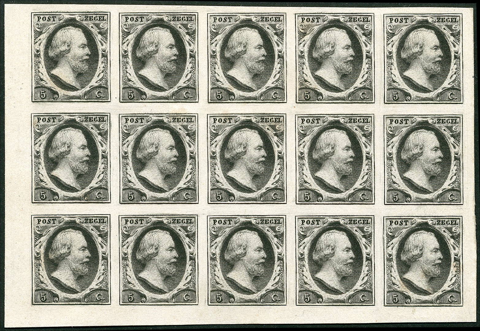 Kleurproef in zwart van de goedgekeurde plaat I op dik wit kartonpapier, zonder watermerk, ongetand, PC.9 (echter volgens Expert Caarls geen proef maar een relatiegeschenk, zie Jubileumboek Po & Po 2016 blz. 48). Kwalitatief schitterend blok van vijftien, linksonder van het vel, pos. 61/75. Luxe gerand, zeer fris van kleur, zonder kreuken of vouwen, kortom onberispelijk. Zeer aantrekkelijk stuk voor elke eerste emissie-verzamelaar!