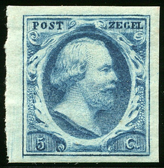 1a-Pl.I-31. 5 Cent diepdonkerblauw, pracht randstuk, zeer fris van kleur, met volle originele gom. € 650