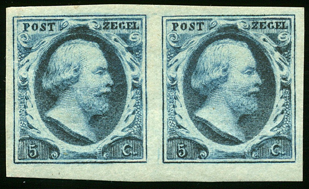 1a-Pl.I-72/73. 5 Cent diepdonkerblauw, breedgerand prachtpaar, met volle originele gom en cert. C.Muis(1996). € 1300+ Ex. De Jong