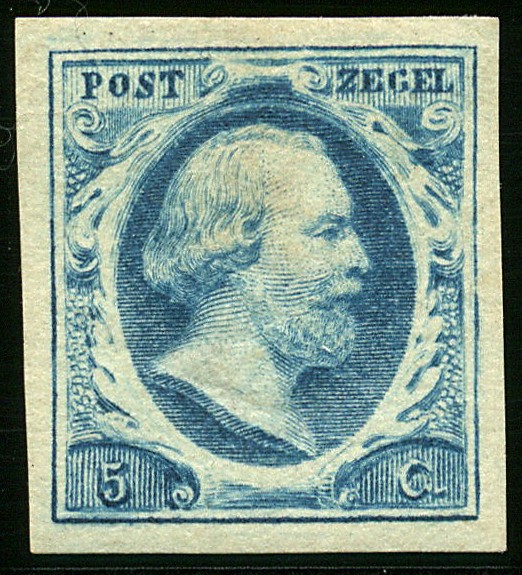 1b-Pl.I-63. 5 Cent blauw, ongebruikt prachtig gerande zegel met volle originele gom waarop enkele plakkerresten, fris van kleur. € 600