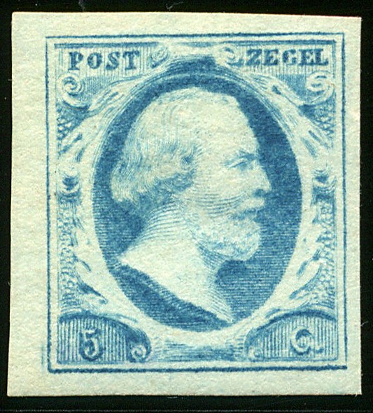 1o-Pl.V-56. 5 Cent blauw, ongebruikt prachtig, breed gerande zegel met volle originele gom waarop zeer minieme plakkerrest, bijzonder fris van kleur. Luxe zegel! Keur 'Williame', attest 'R. Bouscher, 2013'. € 600