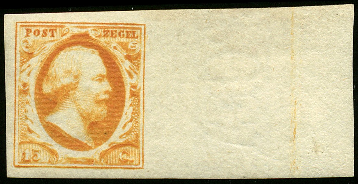 3a, pos.80. 15 Cent donkergeeloranje, ongebruikt breedrandig pracht randstuk met volledige rechter velrand waarin gedeeltelijk watermerk (postz)egel(s). De zegel heeft volle originele gom en is bijzonder fris van kleur. Cert NVPH(1976)