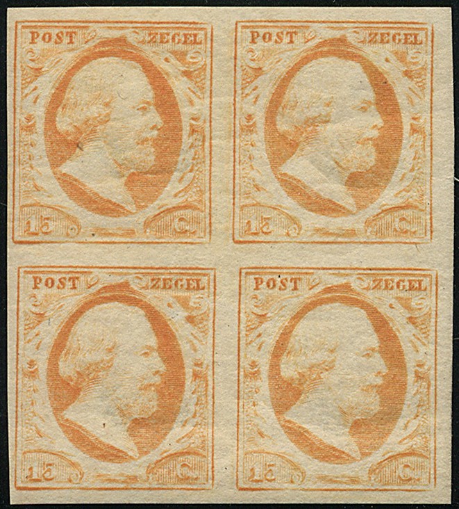 3c, 15 Cent oranje, ongebruikt blok van vier met originele getinte gom. De onderste twee ex. zijn postfris. Zeldzaam prachtstuk met cert. C.Muis(2006). € 7500++