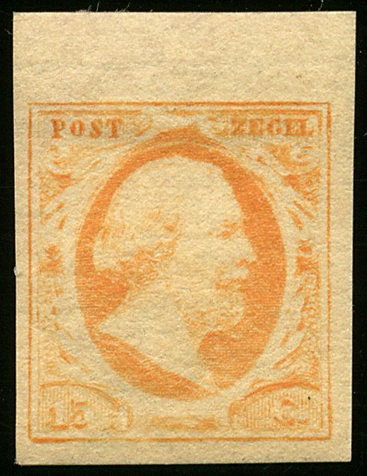 3d, pos. 29. 15 Cent oranjegeel op getint papier. Prachtex. met volle, originele gom en met velrand waarin watermerklijn. Zeer onbeduidend speldenprikje rechtsonder. € 1100