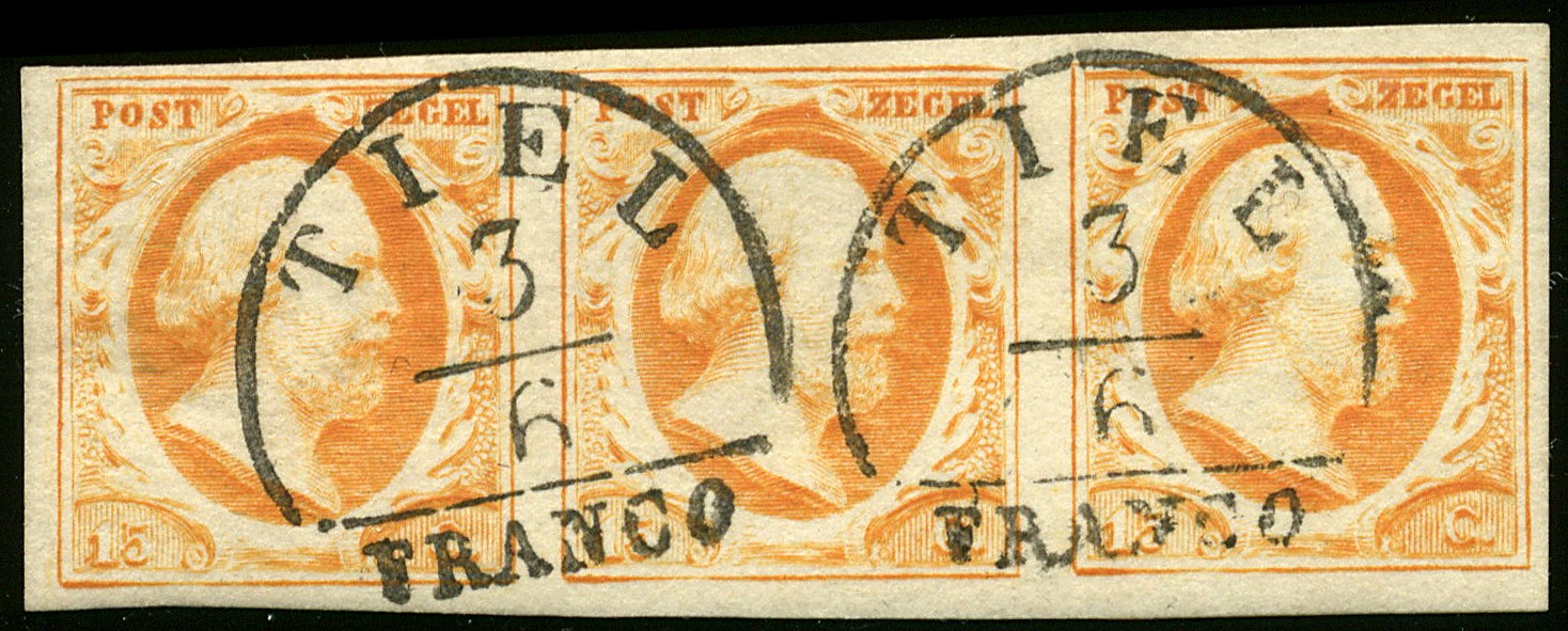 3b, pos. 83/85. Bijzonder mooie prachtstrip van drie met twee luxe afdrukken Tiel A. Keur 'Köhler', Van Dieten veiling 572